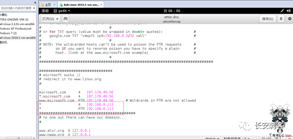 我们的思路是通过ettercap来dns+arp攻击的方法来使xp种木马,对了记得执行service apache2 start命令启动kali web服务,下面我们来设置一下etteracap的etter.dns如图: