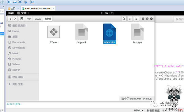 注意:192.168.0.109是kali的ip地址,这时候我们需要service apache2 start启动一下web服务,然后将上面的html保存为index.htm同样丢到kali web目录下,测试访问链接存在如图:
