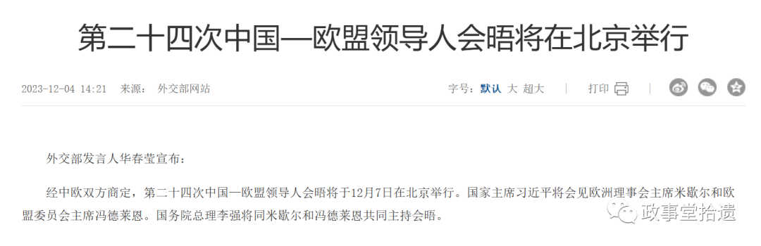 而在第一次会晤的25年后,经中欧双方商定,第二十四次中国—欧盟领导人会晤将于12月7日在北京举行。