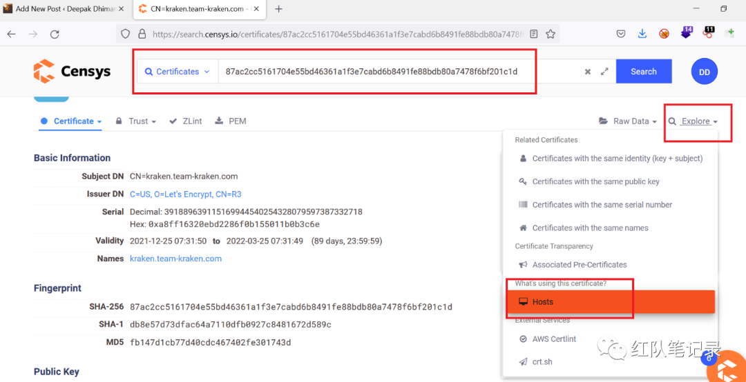 现在打开任何证书,在右侧找到 Explore,将鼠标悬停在它上面并单击主机。