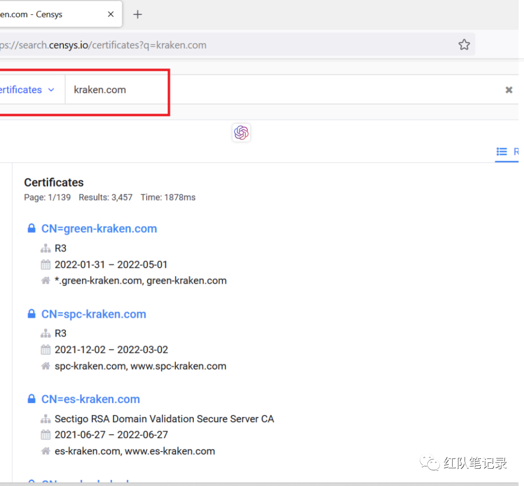 登录到 censys 并转到 censys 搜索页面选择证书,然后在证书中像这样搜索您的目标