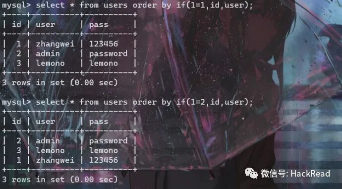 select * from users order by (case when (1=2) then user else id end ); //根据id排序