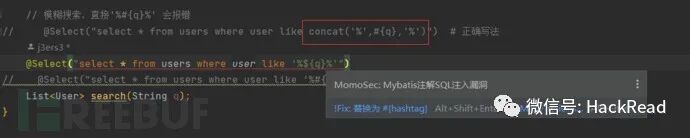 在mybatis中无论是使用xml或者注解编写SQL语句时,都是推荐结合#使用,因为内部使用了预编译,然而在一些特殊场景我们并不能这般,如在like后直接使用#包裹变量在运行时是会报错的,推荐的写法是concat('%',#{q},'%')。