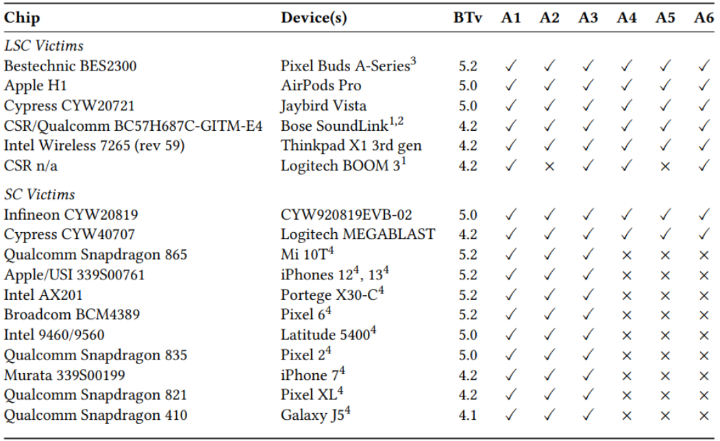 BLUFFS影响了2014年12月发布的Bluetooth 4.2和2023年2月最新发布的Bluetooth 5.4版本。研究人员确认受影响的设备至少受到BLUFFS攻击中3类的影响。