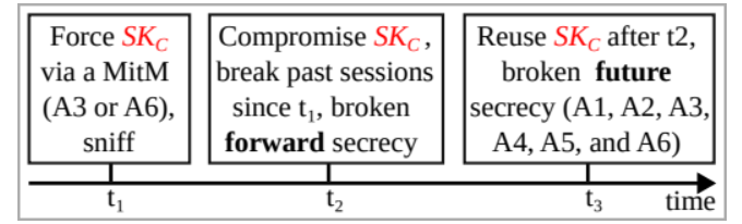 BLUFFS是一系列针对蓝牙的漏洞利用,旨在破坏蓝牙会话的forward and future secrecy,破坏设备之间过去和未来通信的机密性。其中利用的4个漏洞位于会话密钥派生过程,攻击者利用该漏洞可以使派生的密钥是长度较短、弱和可预测的会话密钥。然后,攻击者暴露破解会话密钥,就可以解密过去的通信,解密或操纵未来通信。