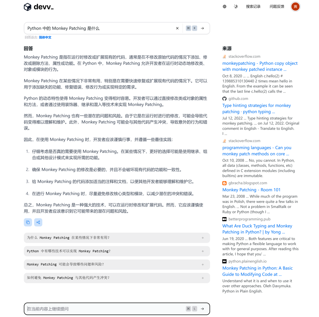 棉花糖博客地址:www.mianhuatang.tkDevv,一款革新的AI搜索引擎,已经成为编程爱好者和专业开发者的新宠。它精准锐利,专注于编程查询,致力于成为Google、StackOverflow以及各类技术文档的有力竞争者。这款工具的诞生离不开其背后的开发团队对各类文档、代码片段以及实时搜索数据进行深度分析和精心构建的结果。他们打造的高效且精确的RAG系统,是在微调升级后的Code Llama和GPT-3.5基础模型上实现的。使用体验方面,Devv.ai表现出色,甚至在某些方面超越了GPT-4。它带来的搜索结果更加清晰易懂,提供的信息源头也是高质量的,使得开发者在面对编程问题时,能够摒弃传统的「搜索引擎 + GPT-4」的解决方案。![]()