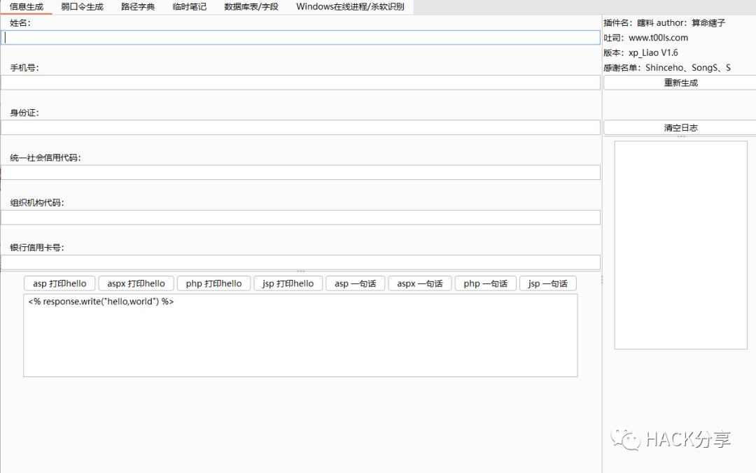 工具简介用于web渗透注册时,快速生成需要的资料用来填写,资料包含:姓名、手机号、身份证、统一社会信用代码、组织机构代码、银行卡,以及各类web语言的hello world输出与对应的一句话木马。根据
