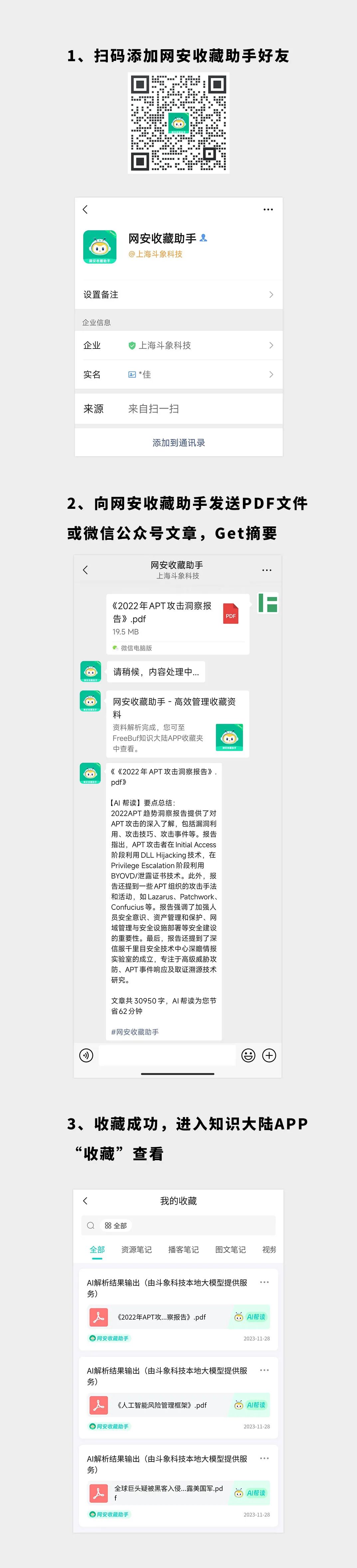 只需将想要收藏的资料微信发送给网安收藏助手,即可自动生成精简的文章摘要,并收藏在知识大陆APP收藏夹中,支持自定义标签。