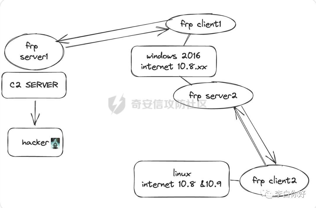 hacker>vps(服务器端)>第一台内网机(客户端)(服务端)>双网卡内网机(客户端)
