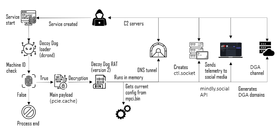 近日,PT CSIRT发现某电力公司遭到Decoy Dog木马的攻击。据悉,至少自2022年9月起,Decoy Dog就一直被Hellhounds组织用于对俄罗斯公司和政府组织的网络攻击。调查显示,该恶意软件活动执行链分为两个阶段。第一阶段涉及利用Decoy Dog Loader,其可执行文件存在于/usr/bin/dcrond中,大小为9KB,受到UPX加壳器的保护,通过伪装成合法的cron、irqbalance服务以及lib7.so库,以在系统中运行。运行期间,加载器首先会读取/proc/self/status 并检查TracerPid值是否为0,以确定它是否被调试。若为0,加载程序会尝试读取每个包含受感染主机标识符的文件,并计算文件系统中存在的第一个文件的MD5哈希值,再利用获取的MD5哈希值作为密钥来解密配置,最终解密出主要载荷,并使用128位的CLEFIA算法进行加密。第二阶段的恶意样本主要有效载荷Decoy Dog存储在/usr/share/misc/pcie.cache中,其实际上是Pupy RAT的修改版本。其中,Pupy RAT是一个跨平台多功能后门和开源后利用工具,由Python编写,支持Windows和Linux,部分支持Android和macOS,具有全内存执行指南,且占用空间最小。Pupy RAT可使用多种传输方式维持与C2服务器的连接,并利用反射注入技术迁移到进程中。目前,Pupy RAT的开发已于两年前停止,但Decoy Dog的开发仍在积极进行中。数据显示,位于俄罗斯的至少20个组织已受到Decoy Dog的攻击。Decoy Dog攻击流程如下图所示。