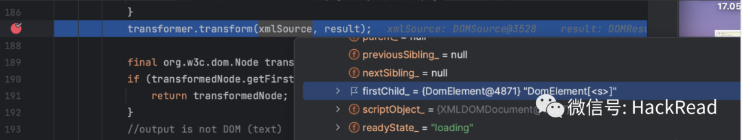 然后debug到第二个断点,查看xmlSource,内容为自己的xml文件