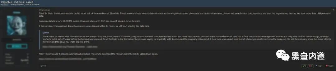 根据该公司上周五向美国证券交易委员会(SEC)的披露文件,今年10月,一名黑客在地下论坛发帖称,他们获取了23andMe用户的档案信息。