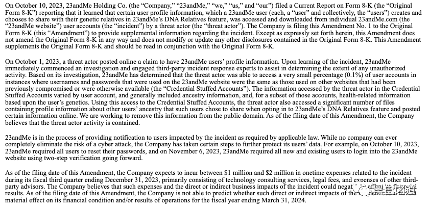 根据SEC披露报告,23andMe预计今年第三财季该事件将一次性产生100-200万美元的费用,主要包括技术咨询服务、法律费用和其他第三方顾问的费用。