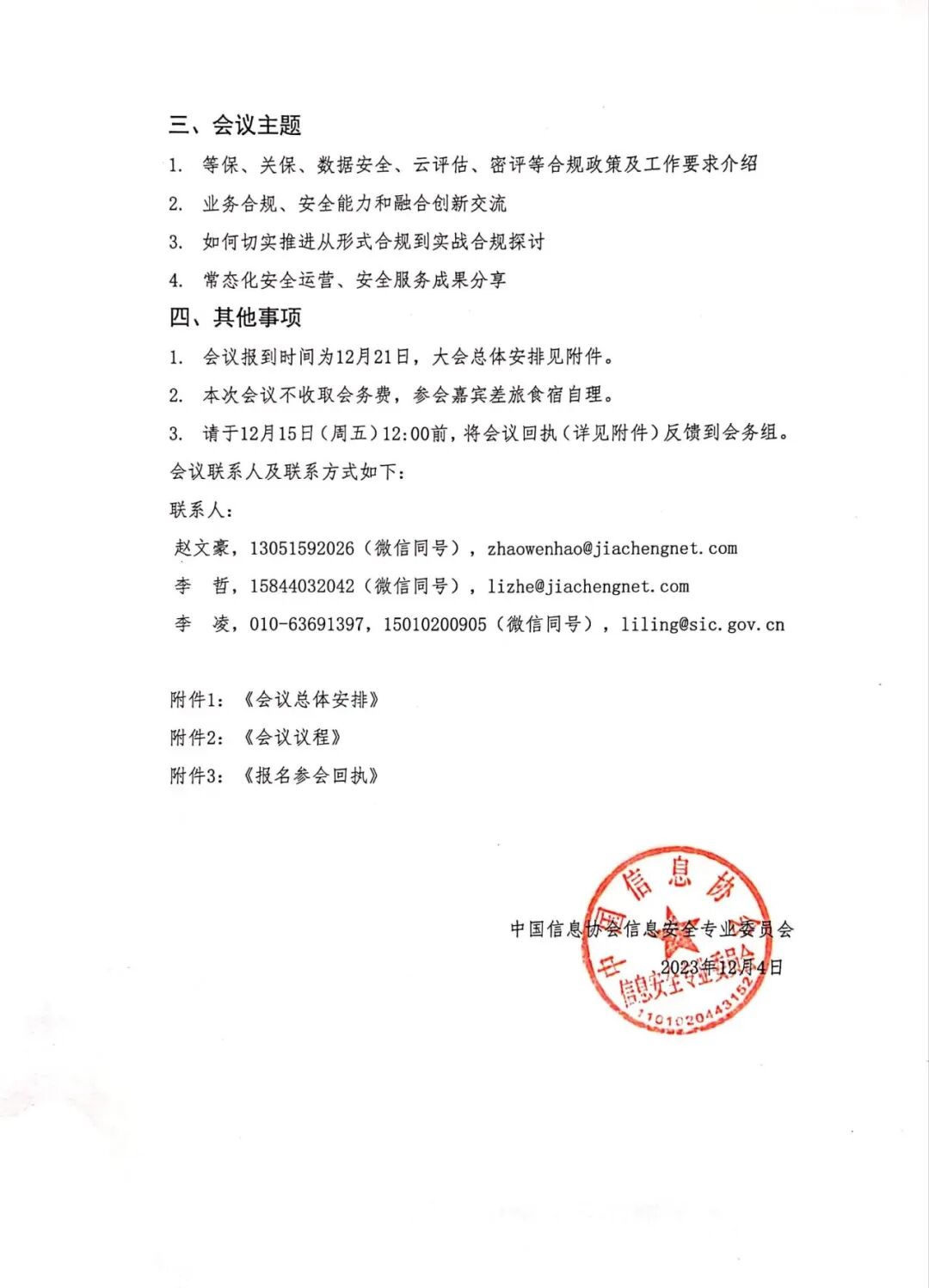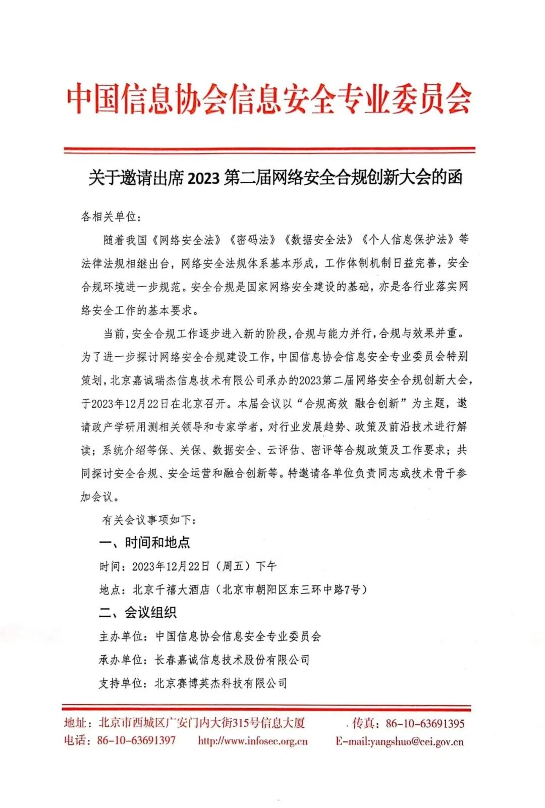 当前,安全合规工作逐步进入新的阶段,合规与能力并行,合规与效果并重。为了进一步探讨网络安全合规建设工作,由中国信息协会信息安全专业委员会主办,长春嘉诚信息技术股份有限公司承办,北京赛博英杰科技有限公司支持的2023SCIC 第二届网络安全合规创新大会,将于2023年12月22日在北京召开。本届会议以“合规高效 融合创新”为主题,邀请政产学研用测相关领导和专家学者,对行业发展趋势、政策及前沿技术进行解读;系统介绍等保、关保、数据安全、云评估、密评等合规政策及工作要求;共同探讨安全合规、安全运营和融合创新等话题。