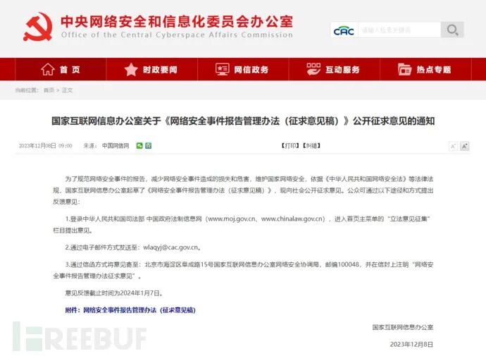 为了规范网络安全事件的报告,减少网络安全事件造成的损失和危害,维护国家网络安全,依据《中华人民共和国网络安全法》等法律法规,国家互联网信息办公室起草了《网络安全事件报告管理办法(征求意见稿)》,并于2023年12月8日发布。