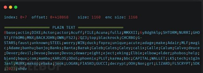 如下所示,8Base 勒索软件团伙部署的 Phobos 样本文件中包含不加密其的其他 Phobos 变种列表。所有样本文件中的配置,都会将特定的组织名称添加到列表的开头。