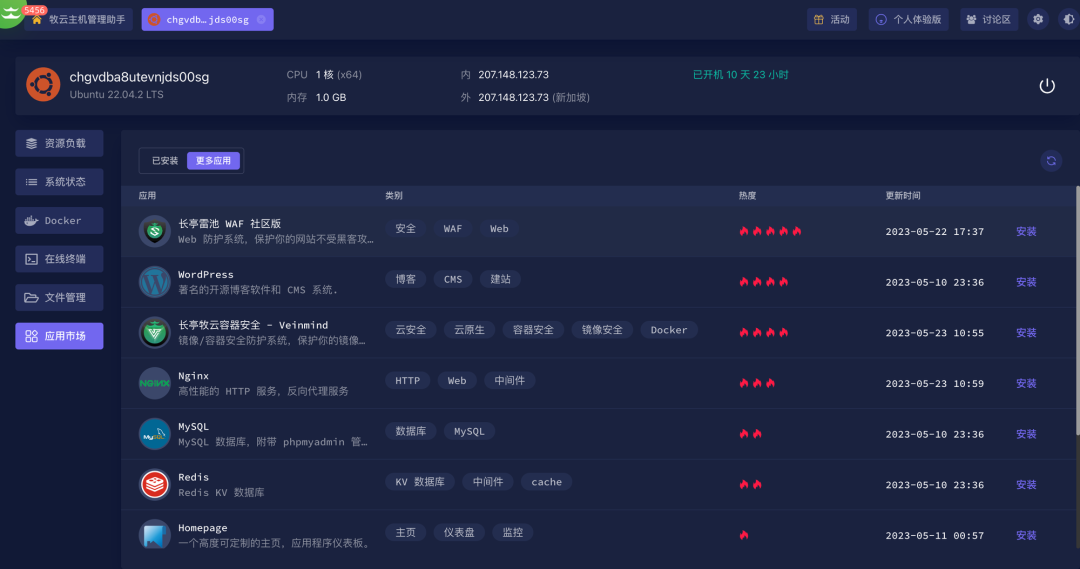增加应用市场,把常见的建站模版( wordpres 、 halo 等)都上架到了应用市场。用户可以一键建站。同时在应用市场也上线了一些常见的开发工具和效率工具( Redis 、 Mysql 、 Nginx 等等等)。