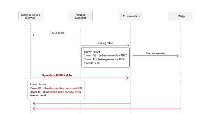 E2Term依赖路由管理器定期发送的路由表信息来与RIC系统中的其他组件建立通信,但E2Term不会验证它接收到的路由表信息的发送方。由于缺乏验证,攻击者可以通过向E2Term发送伪造路由表信息来利用CVE-2023-41627漏洞,通过使用路由管理器以更高的频率将此信息发送给E2Term,攻击者可以欺骗E2Term并中断其与其他组件的通信。