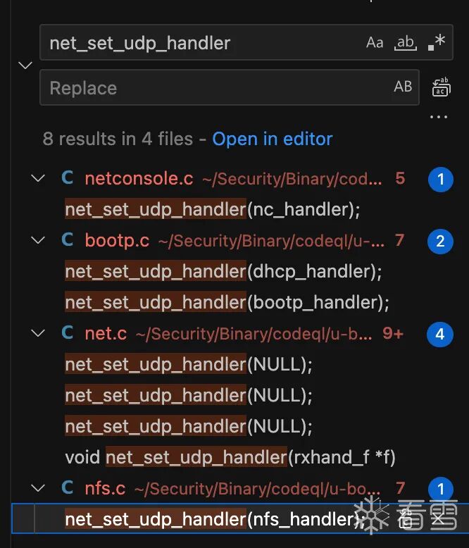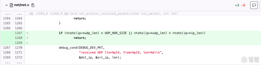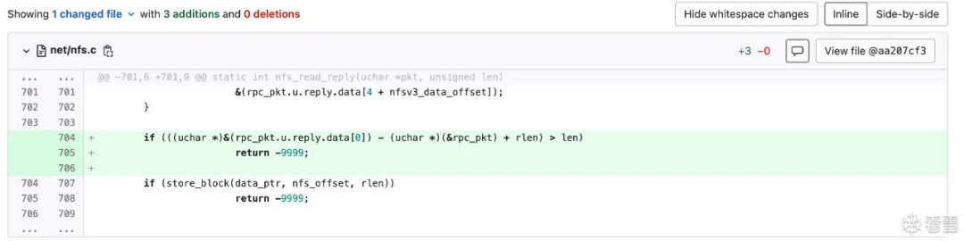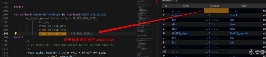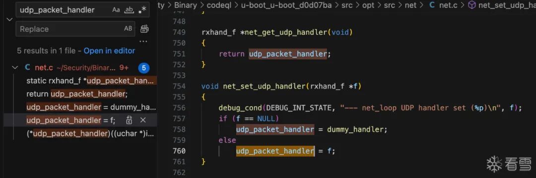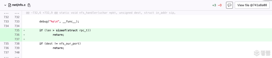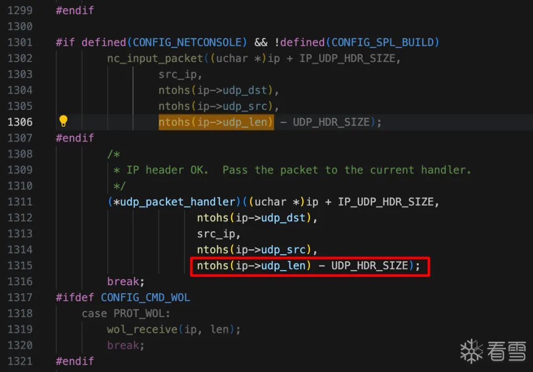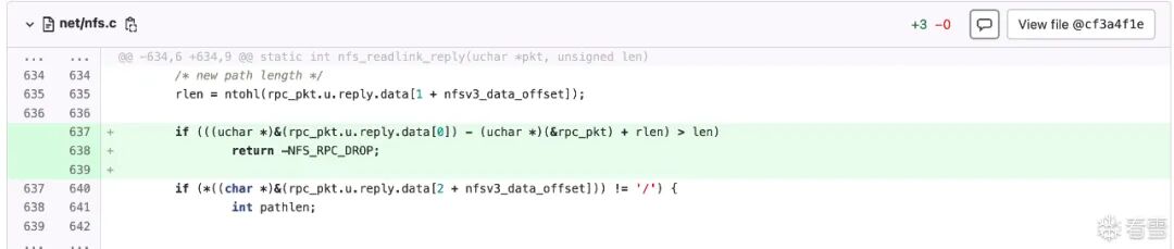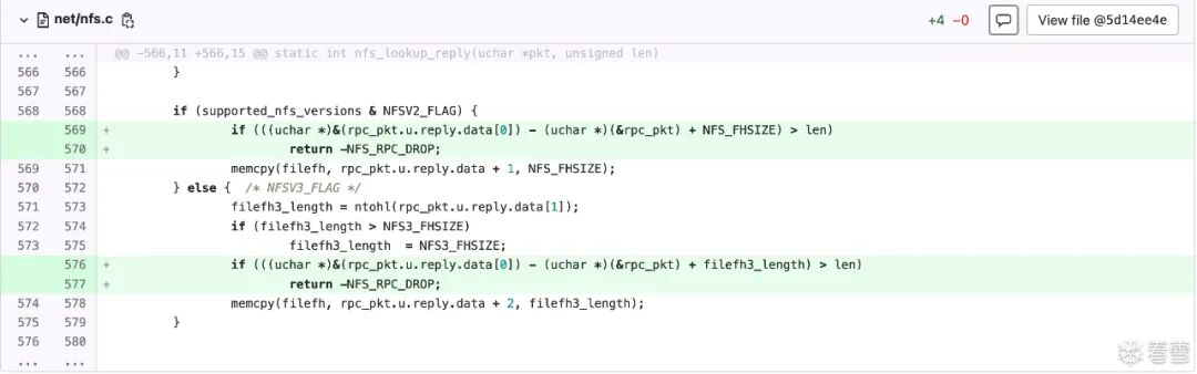 net_process_received_packet的末尾,此处很明显会发生integer underflow:nc_input_packet,但是第149行检测了len的大小,这样我觉得即使传入一个很大的len,这里的memcpy也不会发生越界写。。然而我查了一下,U-Boot NFS RCE Vulnerabilities (CVE-2019-14192)(https://securitylab.github.com/research/uboot-rce-nfs-vulnerability/)说这里是会越界写的。但是他就一句话,没懂。udp_packet_handler,QL的查询结果里没有此处。udp_packet_handler,只有两处赋值的地方:net_set_udp_handler,可以看到分别给nc、dhcp、bootp和nfs都设置了handler。nfs_handler。那就只审计它。可以看到,该函数仍然未校验len,直接在不同分支里将其分别传递给函数:static void nfs_handler(uchar *pkt, unsigned dest, struct in_addr sip,