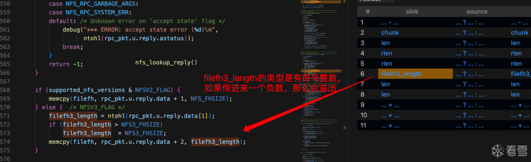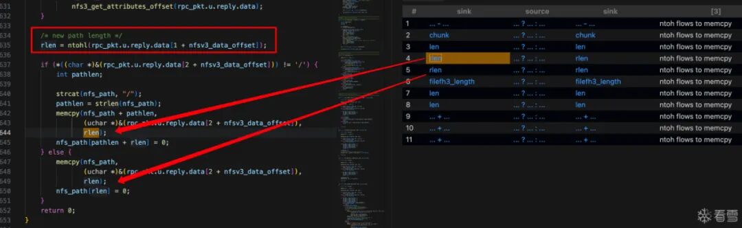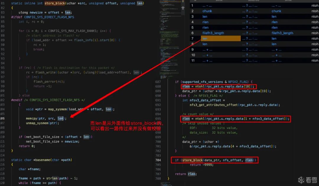 nfs_lookup_reply(),目标buffer:filefh的长度是64,传入的长度是负数的时候就会越界写。漏洞+1。nfs_read_reply的if和else分支里,将可控的rlen传入函数store_block中进行memcpy,可进行任意长度的越界写。96行的函数flash_write同样存在问题。ntoh*的特征?六