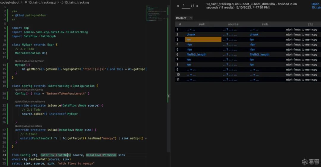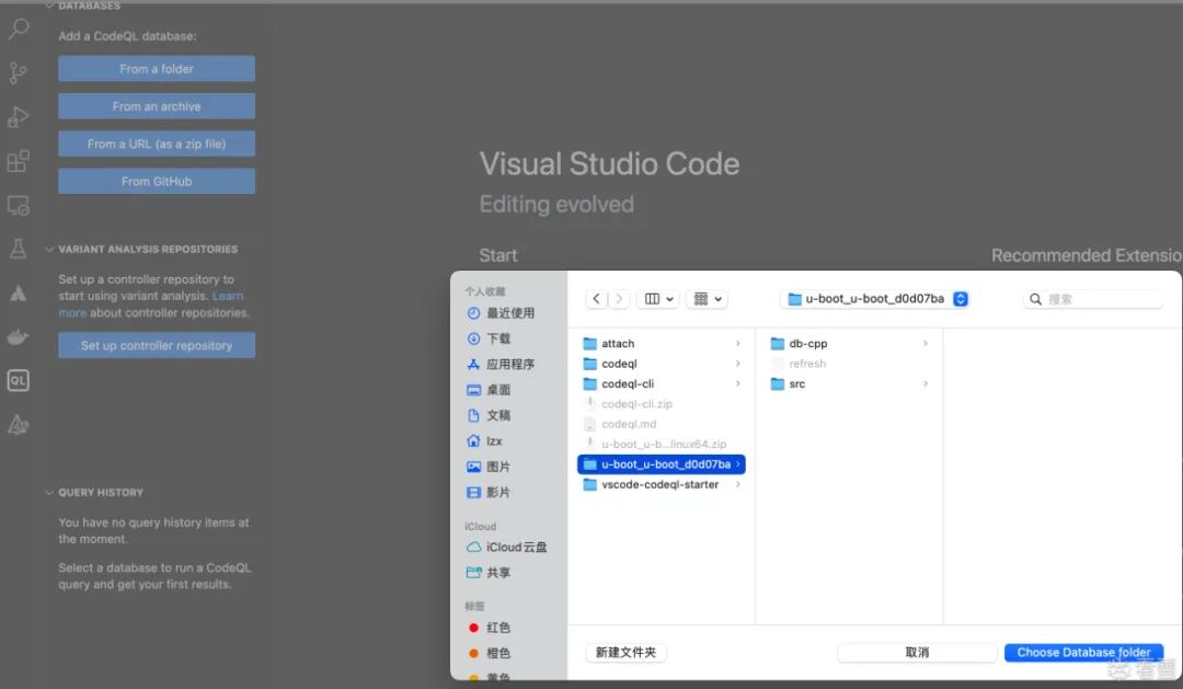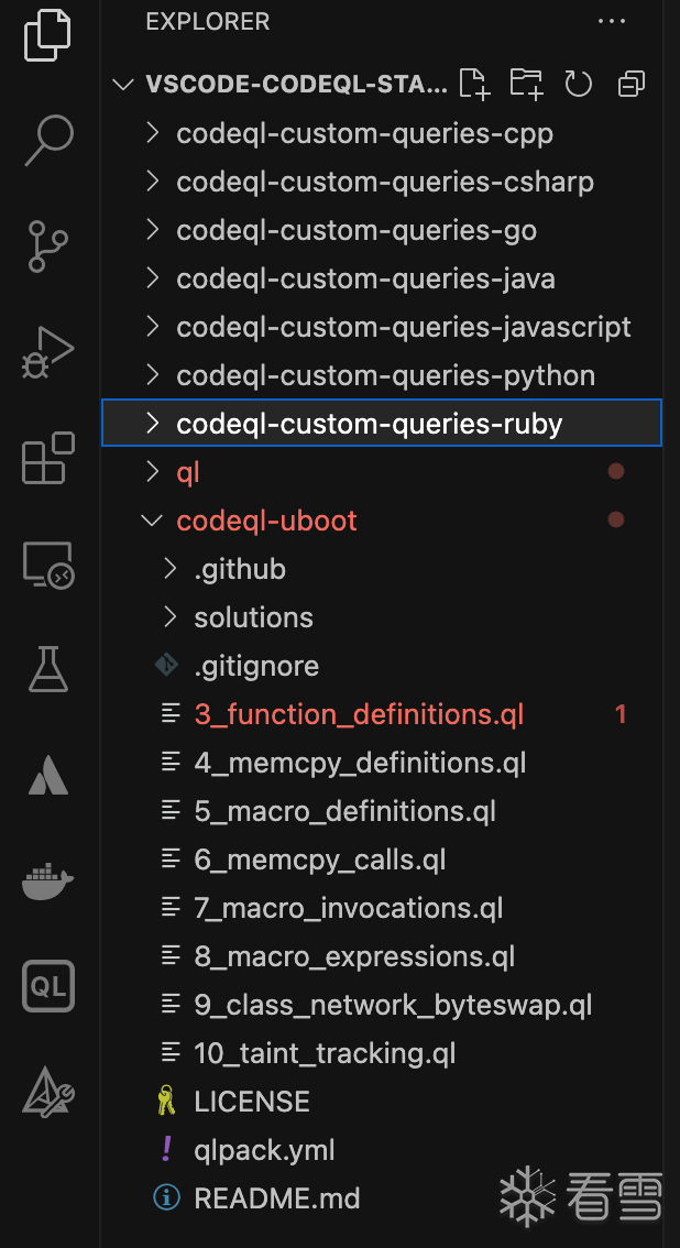 File->Open workspace from file...->选择vscode-codeql-starter.code-workspaceFrom a folder(因为我前面解压了)。参考:choosing-a-database https://codeql.github.com/docs/codeql-for-visual-studio-code/analyzing-your-projects/#choosing-a-database 这个数据库对应的u-boot版本是d0d07ba86afc8074d79e436b1ba4478fa0f0c1b5 https://github.com/u-boot/u-boot/tree/d0d07ba86afc8074d79e436b1ba4478fa0f0c1b5 如果要自己创建数据库,那就clone这个版本的代码,然后再用codeql-cli创建。 proxychains4 git clone https://github.com/u-boot/u-boot.git cd u-boot
