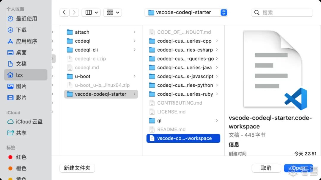 drwxr-xr-x 21 lzx staff 672B 6 6 22:51 vscode-codeql-starter