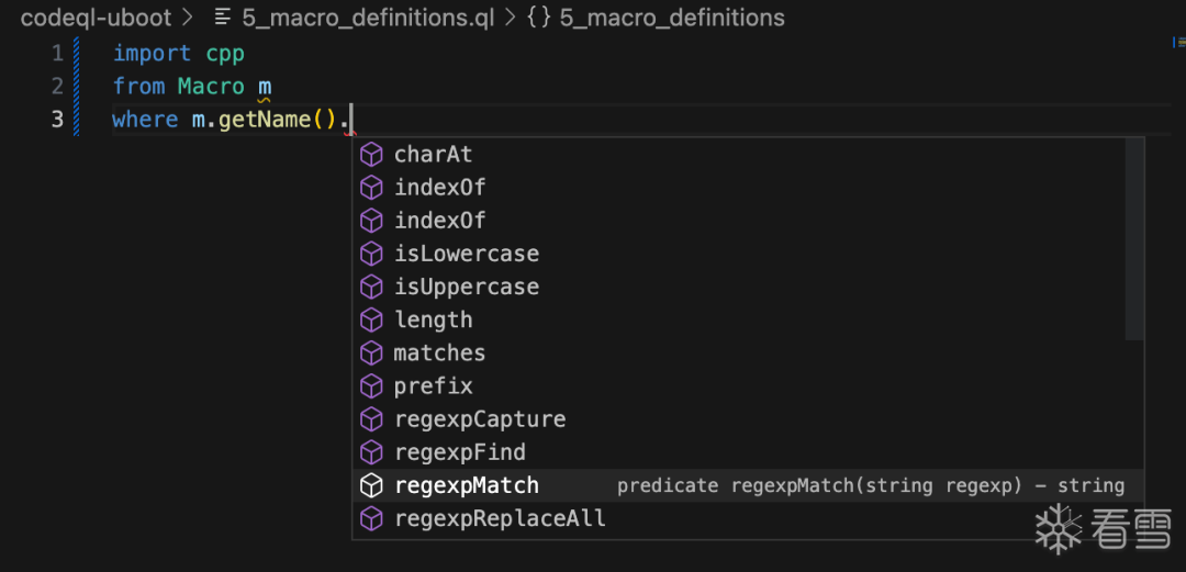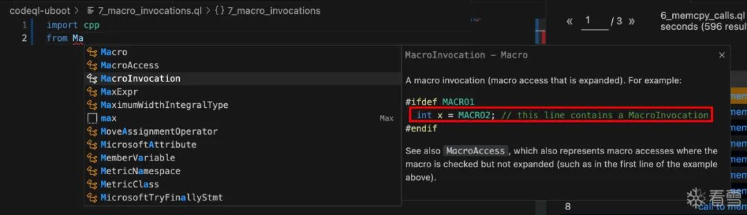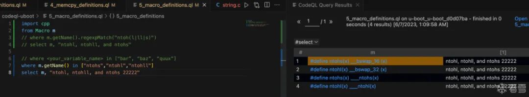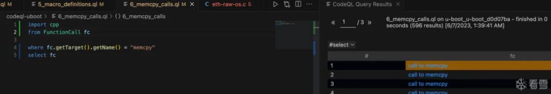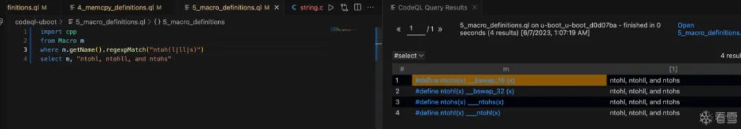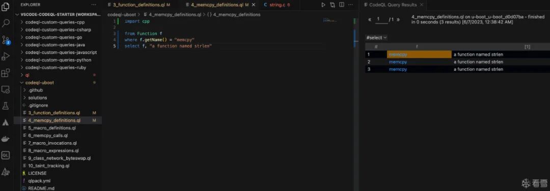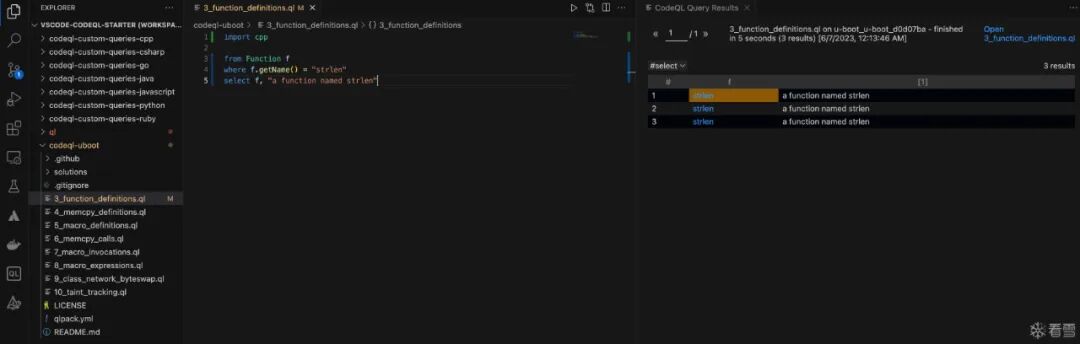 3_function_definitions.ql,右键->CodeQL: Run Queries in Selected Files。import cpp: 导入 c++ 规则库。From Function f: 声明一个 Function 类的变量为 f。where f.getName() = "strlen":f.getName()用于获取此变量的名称,也就是满足条件:和strlen相同的Function会被选出来。select f,"a function named strlen": select的作用是选择要显示的结果,用逗号分隔。嗯,和sql一样。import cpp from Function f