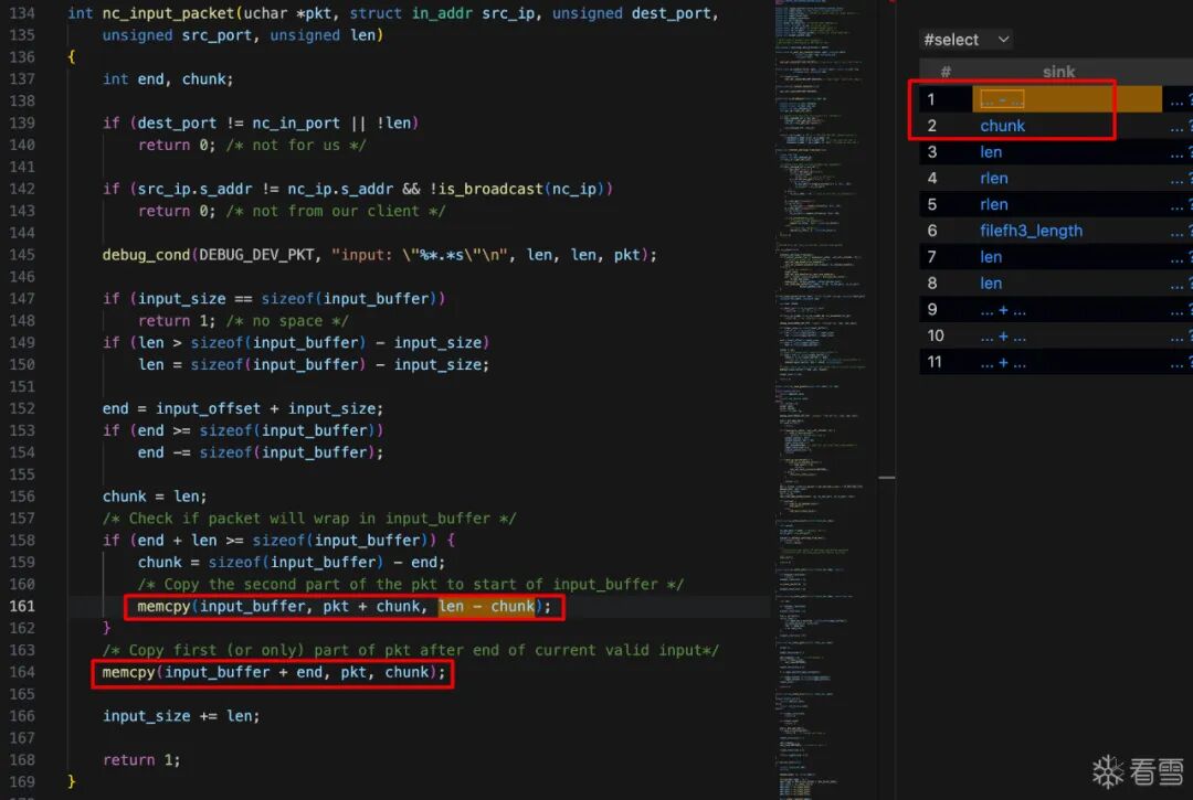 ntohl,ntohll, orntohs. The sink should be the size argument of an unsafe call to memcpy.notch*的调用,sink则应该是不安全函数memcpy的size参数。ntoh 族函数通常用来进行网络字节序到主机字节序的转换。所以这里的意思应该是noth族函数会将外部传入的数据包中的某些数据转换一个数值,而这个数值可能最终会被传给memcpy作为size参数,使得拷贝的长度被攻击者控制,就可能会产生安全风险。