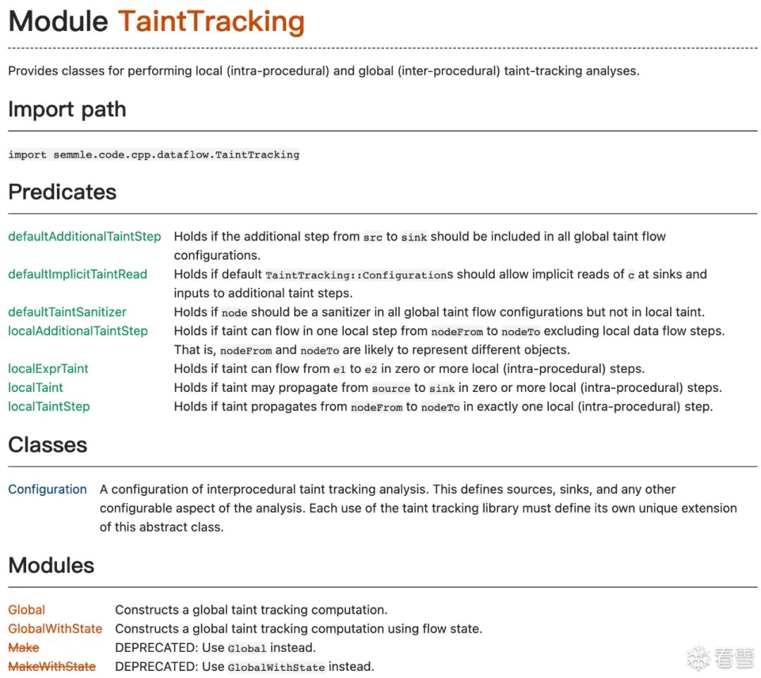 isSource和isSink这两个is开头的谓词(函数)应该是写:判断这个source/sink要满足什么条件,然后返回true/false。但是呢,搂一眼介绍predicate的官方文档(https://codeql.github.com/docs/ql-language-reference/predicates/),按照文档上面的例子来看,只需要写需要满足什么条件就ok:Predicates are used to describe the logical relations that make up a QL program. 谓词用来描述QL程序里的逻辑关系 Strictly speaking, a predicate evaluates to a set of tuples. 严格来讲,谓词的计算结果是一组元组