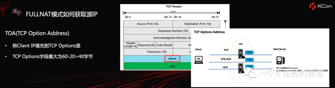 那么其原理呼之欲出,通过在TCP的option字段塞进一个TOA结构,令其携带 "IP信息"从而实现IP透传的功能。