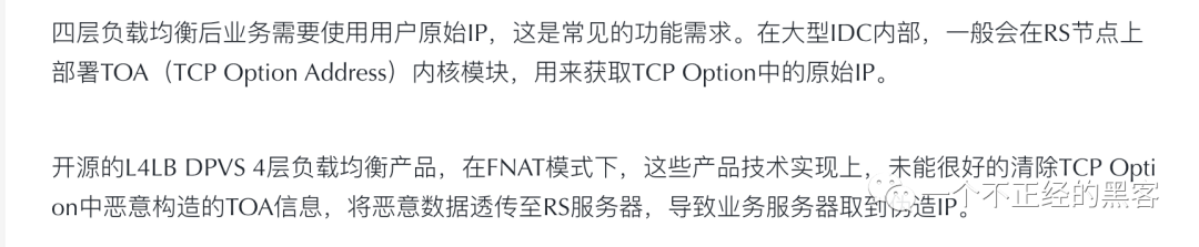 还有就是 ecapture 作者提到的 "L4LB网络中间件DPVS "提到的修复PR,原理是清除用户传入的TOA信息,思路是一样的,很清晰。