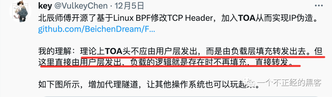 开源工具 HAE 的作者 Key 在X上也发布了关于TOA的一些见解,并给出TOA源IP伪造攻击的防御思路,思路是正确的,不过在这里我泼个冷水,基于现在的TOA设计是没办法做到的,就是"不可防御"的。