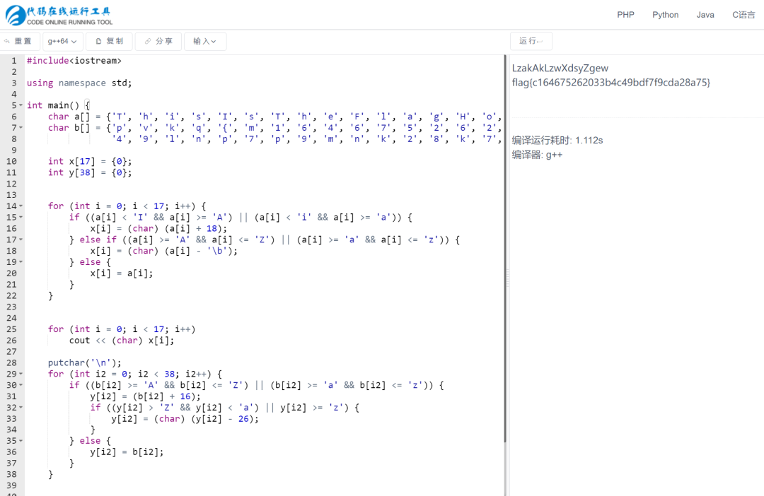 #include<iostream>using namespace std;int main() {char a[] = {'T', 'h', 'i', 's', 'I', 's', 'T', 'h', 'e', 'F', 'l', 'a', 'g', 'H', 'o', 'm', 'e'};char b[] = {'p', 'v', 'k', 'q', '{', 'm', '1', '6', '4', '6', '7', '5', '2', '6', '2', '0', '3', '3', 'l', '4', 'm','4', '9', 'l', 'n', 'p', '7', 'p', '9', 'm', 'n', 'k', '2', '8', 'k', '7', '5', '}'};int x[17] = {0};int y[38] = {0};for (int i = 0; i < 17; i++) {if ((a[i] < 'I' && a[i] >= 'A') || (a[i] < 'i' && a[i] >= 'a')) {x[i] = (char) (a[i] + 18);} else if ((a[i] >= 'A' && a[i] <= 'Z') || (a[i] >= 'a' && a[i] <= 'z')) {x[i] = (char) (a[i] - '\b');} else {x[i] = a[i];}}for (int i = 0; i < 17; i++)cout << (char) x[i];putchar('\n');for (int i2 = 0; i2 < 38; i2++) {if ((b[i2] >= 'A' && b[i2] <= 'Z') || (b[i2] >= 'a' && b[i2] <= 'z')) {y[i2] = (b[i2] + 16); //特别注意:此处使用(char)容易超出有效的字符范围,导致字符溢出或乱码if ((y[i2] > 'Z' && y[i2] < 'a') || y[i2] >= 'z') {y[i2] = (char) (y[i2] - 26);}} else {y[i2] = b[i2];}}for (int i = 0; i < 38; i++)cout << (char) y[i];return 0;}