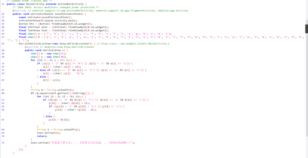 package com.example.findit;import android.os.Bundle;import android.support.v7.app.ActionBarActivity;import android.view.MenuItem;import android.view.View;import android.widget.Button;import android.widget.EditText;import android.widget.TextView;/* loaded from: classes.dex */public class MainActivity extends ActionBarActivity {/* JADX INFO: Access modifiers changed from: protected */@Override // android.support.v7.app.ActionBarActivity, android.support.v4.app.FragmentActivity, android.app.Activitypublic void onCreate(Bundle savedInstanceState) {super.onCreate(savedInstanceState);setContentView(R.layout.activity_main);Button btn = (Button) findViewById(R.id.widget3);final EditText edit = (EditText) findViewById(R.id.widget2);final TextView text = (TextView) findViewById(R.id.widget1);final char[] a = {'T', 'h', 'i', 's', 'I', 's', 'T', 'h', 'e', 'F', 'l', 'a', 'g', 'H', 'o', 'm', 'e'};final char[] b = {'p', 'v', 'k', 'q', '{', 'm', '1', '6', '4', '6', '7', '5', '2', '6', '2', '0', '3', '3', 'l', '4', 'm', '4', '9', 'l', 'n', 'p', '7', 'p', '9', 'm', 'n', 'k', '2', '8', 'k', '7', '5', '}'};btn.setOnClickListener(new View.OnClickListener() { // from class: com.example.findit.MainActivity.1@Override // android.view.View.OnClickListenerpublic void onClick(View v) {char[] x = new char[17];char[] y = new char[38];for (int i = 0; i < 17; i++) {if ((a[i] < 'I' && a[i] >= 'A') || (a[i] < 'i' && a[i] >= 'a')) {x[i] = (char) (a[i] + 18);} else if ((a[i] >= 'A' && a[i] <= 'Z') || (a[i] >= 'a' && a[i] <= 'z')) {x[i] = (char) (a[i] - '\b');} else {x[i] = a[i];}}String m = String.valueOf(x);if (m.equals(edit.getText().toString())) {for (int i2 = 0; i2 < 38; i2++) {if ((b[i2] >= 'A' && b[i2] <= 'Z') || (b[i2] >= 'a' && b[i2] <= 'z')) {y[i2] = (char) (b[i2] + 16);if ((y[i2] > 'Z' && y[i2] < 'a') || y[i2] >= 'z') {y[i2] = (char) (y[i2] - 26);}} else {y[i2] = b[i2];}}String n = String.valueOf(y);text.setText(n);return;}text.setText("答案错了肿么办。。。不给你又不好意思。。。哎呀好纠结啊~~~");}});}@Override // android.app.Activitypublic boolean onOptionsItemSelected(MenuItem item) {int id = item.getItemId();if (id == R.id.action_settings) {return true;}return super.onOptionsItemSelected(item);}}