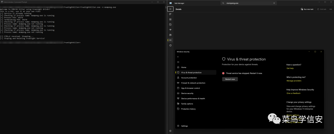 TrueSightKiller 是 CPP AV/EDR 杀手。此驱动程序可用于启用了 HVCI、loldrivers 阻止列表或 WDAC 的 Windows 23H2。HVCI 旨在确保内核中执行的代码的完整性,但它无法防止所有可能的漏洞或可通过驱动程序或系统接口执行的操作。要使用 TrueSightKiller,您需要将 truesight.sys 驱动程序与可执行文件位于同一位置。运行可执行文件时,将显示一个选项菜单,您可以在其中指定进程 ID 或名称。然后程序将进入无限循环,持续监控指定的进程。若要停止程序并删除服务,请发送 ctrl+c 命令。- 通过 WDAC 阻止此驱动程序或等待 Microsoft 执行此操作(风险自负)