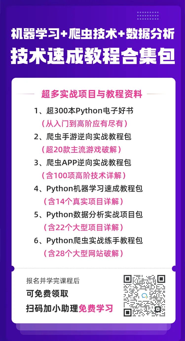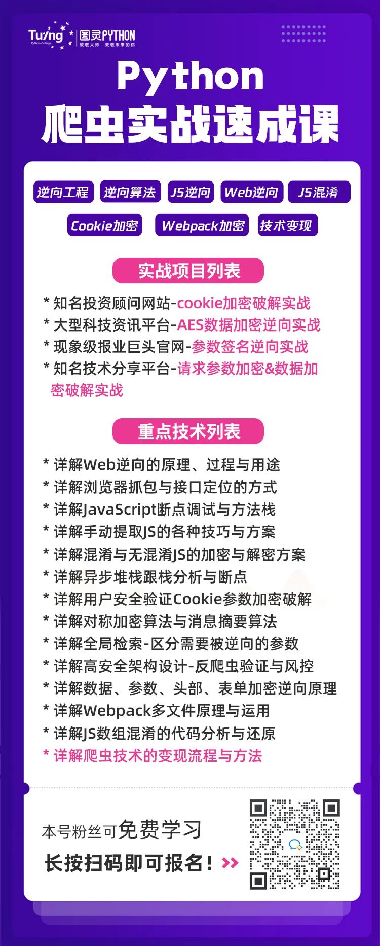 官方特训费299元,本号粉丝有福利,立即报名可免费学习!这是一套专讲爬虫与反爬虫攻防的高阶技术实战课,迄今为止已帮助近三万学员快速进阶。本次课程将由国际大数据竞赛获奖大佬亲身指导,带领大家进行一线大厂高阶技术体系+爬虫与反爬虫攻防实战+技术变现路径指导的综合速成训练!![]()