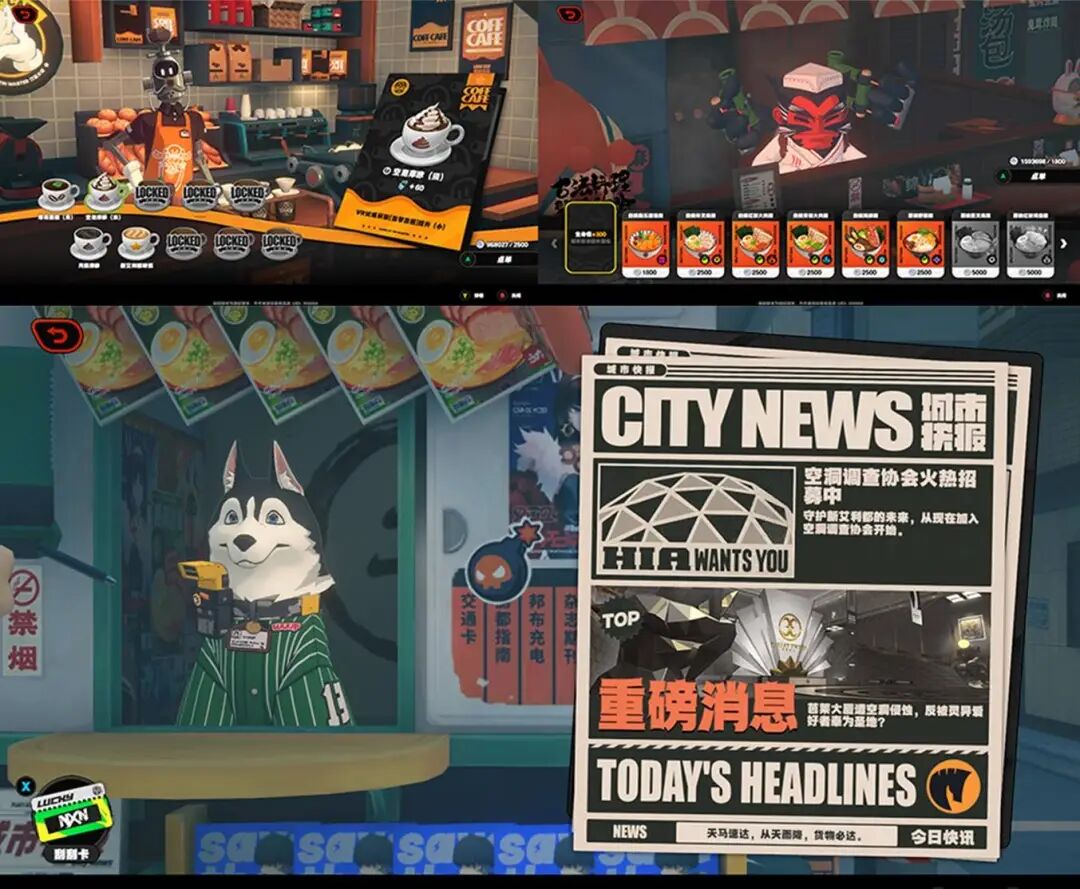 昏暗的灯光下,一台老式复古 CRT 电视,正循环播放着各种电视广告。这是米哈游旗下最新游戏——《绝区零》的登录界面,换作是《原神》里的天空岛,或是《崩坏星穹铁道》中驶向银河的列车,大部分人估计会不假思索,直接点击进入游戏。不过,如果你愿意在《绝区零》的登录界面多待几分钟,的确会看到意外的惊喜。我细数了下,不到5分钟的时间内,这台电视足足播放了 14 条不重样的广告内容:有致敬特摄片的《星辉骑士》,有怪诞惊悚风的《波特山》,还有风格鲜明的能量饮料、运动球鞋和街头潮玩店广告......光是一个登录界面,就能埋下这么多梗,也能看出制作这款游戏的团队,是一群什么样的人了。如果说米哈游之前的《原神》、《崩坏:星穹铁道》,亦或是更早的《崩坏3》,在题材上都偏向奇幻冒险风格,那么《绝区零》,则更多呈现出一种二次元与潮流文化的碰撞融合,反倒带有些叛逆和不羁。两个月前,在接受日本 IGN 采访时,《绝区零》游戏制作人李振宇就曾表示:「都市元素,是本作有别于原神等其它米哈游游戏的重要特征之一。」设计师出身的他,更希望在风格上,做出明显的改变。这似乎也奠定了某种基调:绝区零,不太米哈游。或者说,是米哈游的 B 面。六分街的整体风格,能让你联想起许多潮流街头文化空间一来,是来自场景的感知:《绝区零》的主城区「六分街」融入了大量的街头、潮流风格元素,而且各家店面都进行了精心设计。每家门店都具备功能性,比如咖啡店和拉面店均可以提供增益buff这里有开咖啡店的机器人,装有机械义肢的拉面店老板,以及看管报摊亭的小狗。还有一间电玩街机厅,内置了两款致敬《贪食蛇》和《钻头小子》的街机游戏,而且,你真的可以上手去玩。加上随处可见的街头涂鸦、宣传海报、手写体招牌,以及来回行走的学生和路人,整个《绝区零》都营造出一种上世纪八九十年代的街头风,这对于玩家感知游戏格调,也起到了很好的效果。游戏内的主角所经营的录像店,更是充斥着各种复古怀旧要素:雅达利游戏主机、老式收音机、拍立得,以及布满货架的录像带影片......你发现了吗,前文提到的登录界面中那台电视机,其实就摆在主角房间的沙发正前方。再者,《绝区零》的整体UI风格,也在有意识地与「潮酷」主题相融合。比如通过电视墙的表现手法来展现关卡,将剧情事件制作成一盘盘录像带,以及各种带有渐变色彩、闪烁特效的动态按钮等……种种这些,其实所有的设计都是在契合潮流的基调,强突显游戏的时尚感。还有角色的展示界面,每切换一个菜单栏,就会变换一次运镜,对角色不同角度进行展示,搭配上节奏感极强的电子背景音乐,都让游戏迸发出一种莫名的「张力」。通过各种界面细节、场景内容等设计表达,来展现游戏内文化、世界观的「自洽性」,这在《女神异闻录》、《Splatoon》等很多强风格化的游戏中,已经有了很好的诠释。在《绝区零》中,项目团队也在有意展现出自己对于都市风、街头感和潮酷文化的理解和认知。这也让本作在艺术风格的表达上,成为了目前米哈游游戏中,独树一帜的存在。如果单纯描述游戏玩法的话,《绝区零》乍看之下算是个挺朴素的「3D 即时动作 RPG」,标准的多角色小队副本探索,并融入了Rogue自由选择元素,最终达到通关目的。但在体验了近 20 个小时后,我发现《绝区零》的战斗可以划分到「高速动作游戏」那一类:它比预想中要更爽快,更刺激,也更炫。这种感受来源于多个方面,首先最直观的一点,是战斗的「等待时间」明显变少了。具体来说,我们在《原神》中看到的「换人 CD」、「技能 CD」,均在《绝区零》里被移除——尤其是切人这一操作,完全是 0 延迟触发,甚至达到了上一个角色还在放技能,下一位角色就已经出场的情况,衔接极其丝滑流畅。加上《绝区零》的战斗方式,是需要攻击敌人来叠满失衡值,从而实现破防;而战斗场地,又多为平面线性关卡,各个接敌区之间的间隙很短,也变相加快了战斗节奏。种种因素导致下,《绝区零》的战斗,其实是「鼓励进攻」的,玩家几乎不需要等待各种 CD 时间,或是无意义追怪闪避,或是寻求防御,「干架」几乎成了战斗中的唯一选择,主动进攻的欲望也变得更为强烈。其次,绝区零在战斗运用了大量定格帧与特写镜头,来提升战斗演出的表现力,进一步拉满了游戏的爽感。一个是「极限支援」,这是游戏中将「防反」与「切人」融合的机制,如果是近战角色实现判定,你就能看到类似《只狼》中的「弹刀」效果,配上熟悉的打铁声,确实非常带感。此外,当玩家触发连携技 QTE 时,镜头还会直接拉近,给当前角色一个慢动作特写镜头,并会无缝切换到下一个释放技能的角色。最后,在收尾战斗时,时不时还会看到一组多视角的慢动作镜头,这里巧妙地结合了「GlitchArt」故障特效来提升视觉冲击力,其实也与游戏中通过电视墙来推进关卡的设定相符合。还有一点出乎意料,我在测试中试玩过的角色,几乎没有看到动作复用的情况——不管是角色待机、疾跑,还是战斗中的出招姿态,每个角色基本都使用了独立的动作模组。单看这点,《绝区零》角色所拥有的动作数,或许要比米哈游在原神、崩铁中要多得多,我想每一位经历过「动作模组复用」洗礼的玩家,更会对老米这波升级感触良深。往大了说,产品管线的成熟化,让原神和星铁都实现了 42 