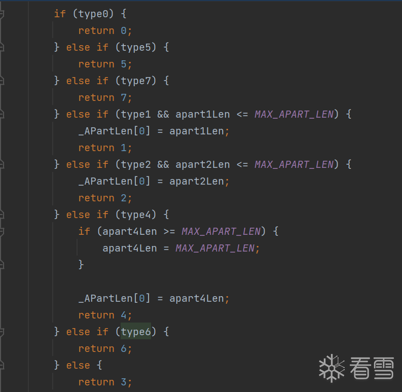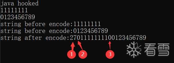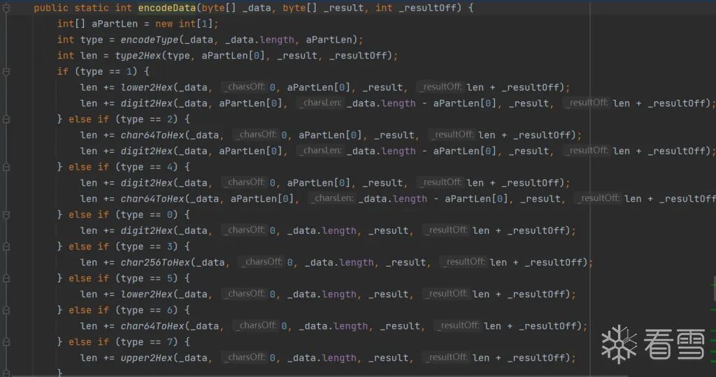 看上去有些重叠,比如type6涵盖了除type3的所有。这是因为它返回的时候也是有先后顺序的:对于8种不同的type的详细encode,感兴趣的师傅可以查阅一下csdn上的源码,这里挑两个比较有意思的。首先是ssid和passwd全是数字的情况,通过下面这个js脚本可以打印encode前后的字符串(这里是对csdn上demo的hook):function hook_java(){ Java.perform(function(){