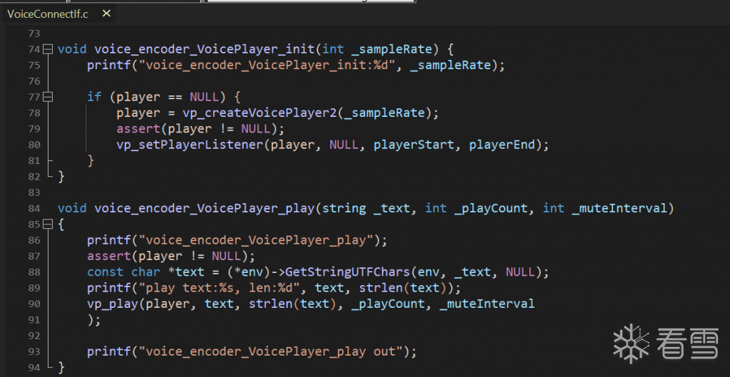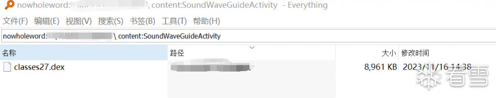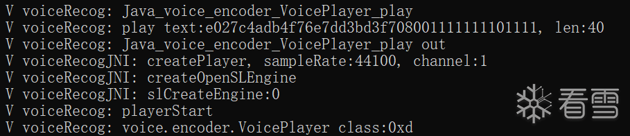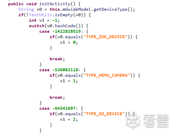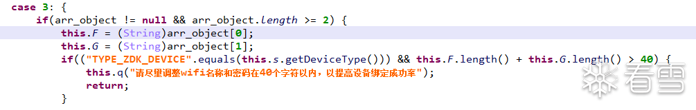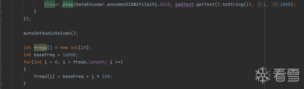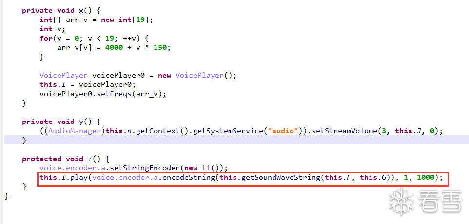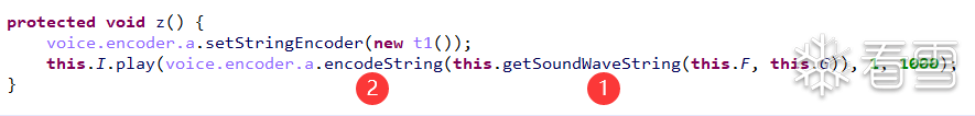 然后通过adb shell执行"dumpsys activity top | grep ACTIVITY"这行命令就可以列出顶层的activity,也就是需要尤为关注的内容:通过"Everthing"或者其它字符串搜索工具搜索"SoundWaveGuideActivity",能够定位到如下dex。用JEB对该dex进行简单的逆向可以知道整个流程应该是在"soundWaveGuide.control"中进行的。首先输入的SSID和passwd会被分别存入this.F和this.G:然后到下面这个地方会对传入的SSID和passwd进行处理然后通过"play"方法进行播放。"play"和"encodeString"方法都不是在这个dex实现的,同样可以通过搜关键字符串的形式进行查找,最后在16.dex里找到了"play"方法的具体实现:好在这个app在运行的时候会有一些关键的log,能够通过"adb logcat"进行打印获取:通过搜索"play text"最终定位了具体的原生库文件:对原生库文件进行分析
