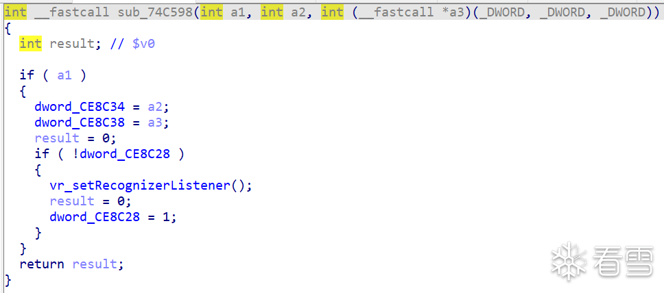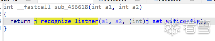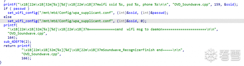 在固件中能看到一个名为"connect_wifi.sh"的sh脚本,脚本主要的作用是通过wpa_supplicant.conf中的内容去连接wifi。wpa_supplicant.conf的格式如下:搜索存在"wpa_supplicant.conf"的elf可以发现有如下调用:那么可以确定是ipcam这个elf对声波进行识别,并把内容保存到"wpa_supplicant.conf"中,然后在"daemon"中执行"connect_wifi.sh"连接wifi。该函数会被当作参数传递到"vr_setRecognizerListener"中进行处理:这里应该是某个结构体的虚表跳转,那么想继续从固件里看出东西的话就很困难了。但其实可以看出有很多地方都有调试的打印,而且这个设备是有UART调试串口的,所以应该可以通过调试打印的信息定位后续处理的位置。所以暂时放弃对接收方的研究,去逆向一下发送方(app)的逻辑。发送方app的逆向分析