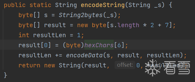 前面这个"2"是ssid的2 | [16&(len-1)]>>4得到的,"7"是ssid-12,3的两个"0"是type,表示ssid和passwd都是全数字,而全数字的encode就直接返回原来的字符串。一开始我也很好奇这里为啥不是"6"而是"c",一看源码发现它乘了个2:以passwd为例,用cyberchef encode也能进行验证:原生库中的内容其实主要是对编码后的字符进行播放,这涉及的是一个比较庞大的框架,以及涉及很多的信号与系统的原理。而对于我们安全研究人员,其实更关心的是如何控制发送的数据,然后这些数据传入到设备后有没有可能产生漏洞,所以对声波和字符的对应关系笔者就浅尝辄止了。而在知道如何编码ssid和wifi以及手上有so文件的情况下,我们可以编写一个demo一样的app,调用原生库函数来向目标设备发送配网信息,所以对声波的分析就没有再进行下去了(其实是笔者在经历长时间被c++虚函数的折磨后啥都没有发现的借口罢了23333)。通过这次的研究之旅,体验了从硬件、音频、设备固件、app、原生库这几个不同的层面对一个设备进行分析并最终成功破解了声波通信的协议,达到了可以发送符合协议的声波数据的目标,可谓收获良多。最后还要感谢void*爷和oacia爷对于本篇提到的安卓逆向的指导ORZ。看雪ID:Nameless_a