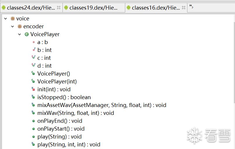 Java.use("voice.encoder.VoicePlayer").play.overload('java.lang.String', 'int', 'int').implementation = function(a1,a2,a3){