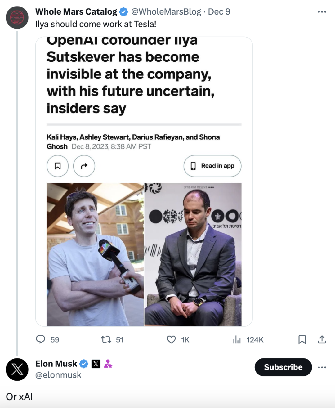 上个月底,OpenAI 正式官宣 Sam Altman 回归。Altman 在一份声明中表达了对首席科学家 Ilya Sutskever 的肯定,并表示希望他留下。但据 Business Insider 报道,Sutskever 近日在 OpenAI 变得「隐形」,在 Altman 回归后,Sutskever 就没有出现在办公室内。上周三,Sutskever 在 X 上发文称「在过去一个月里,我学到了很多教训。其中一个教训是,『士气如未提升,鞭打仍会继续』这种情况出现的频率比它应有的要高」。这句话讽刺的是一个怪圈:士气低落会引起惩罚,而惩罚又会进一步加剧士气低落。这个贴文在发出来的第二天就被删掉了。此外,报道称,Sutskever 还聘请了自己的律师 Alex Weingarten,负责其诉讼业务。一名 X 用户在分享该报道时写道「Ilya 应该加入特斯拉」,马斯克回答道:「或者 xAI」。消息称小米汽车发布会定档 12 月 28 日